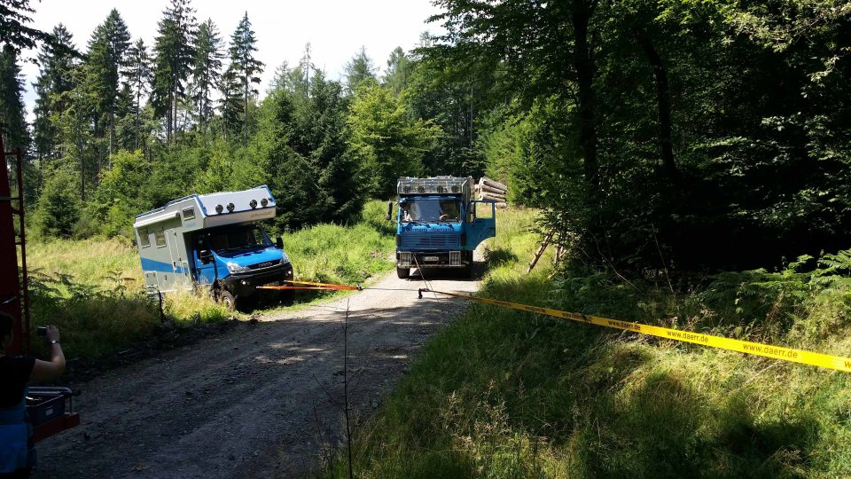 Erster Einsatz der Seilwinde. Hermine holt das Bimobil aus dem Wald.
