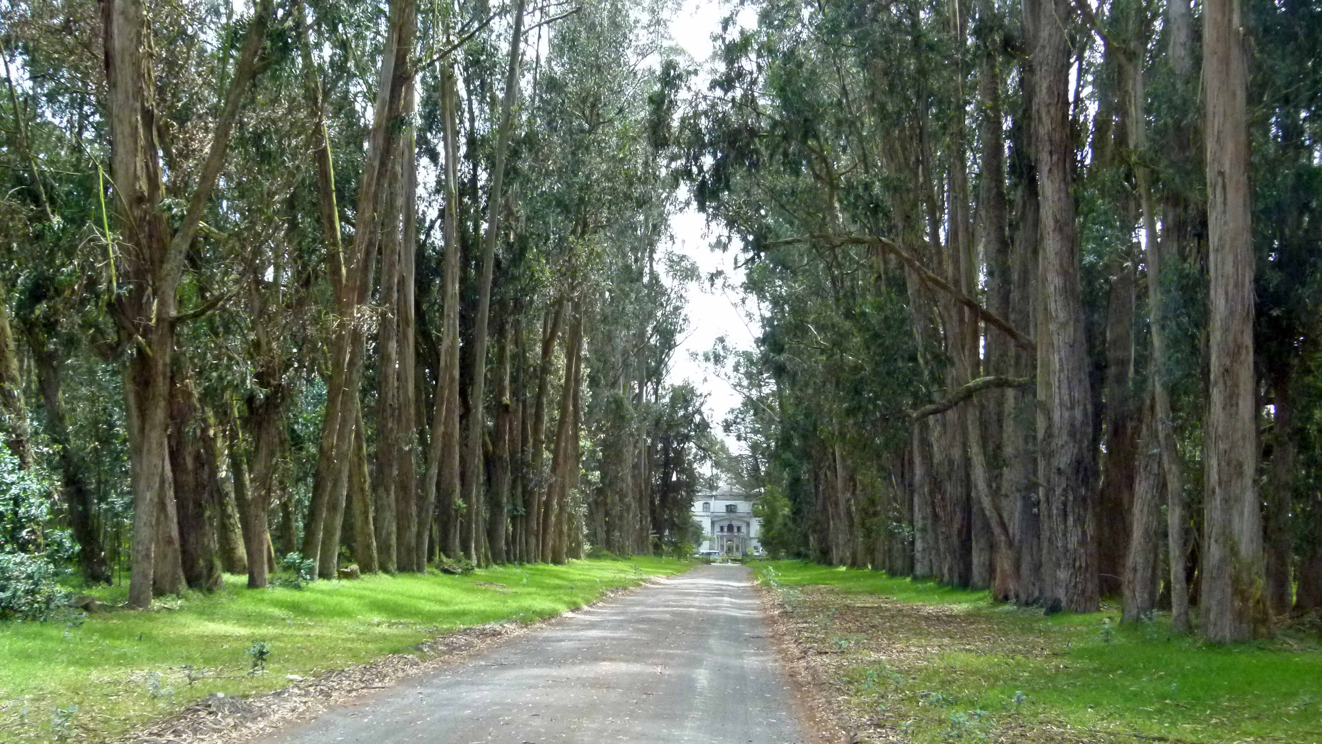 durch eine Allee mit alten Bäumen.